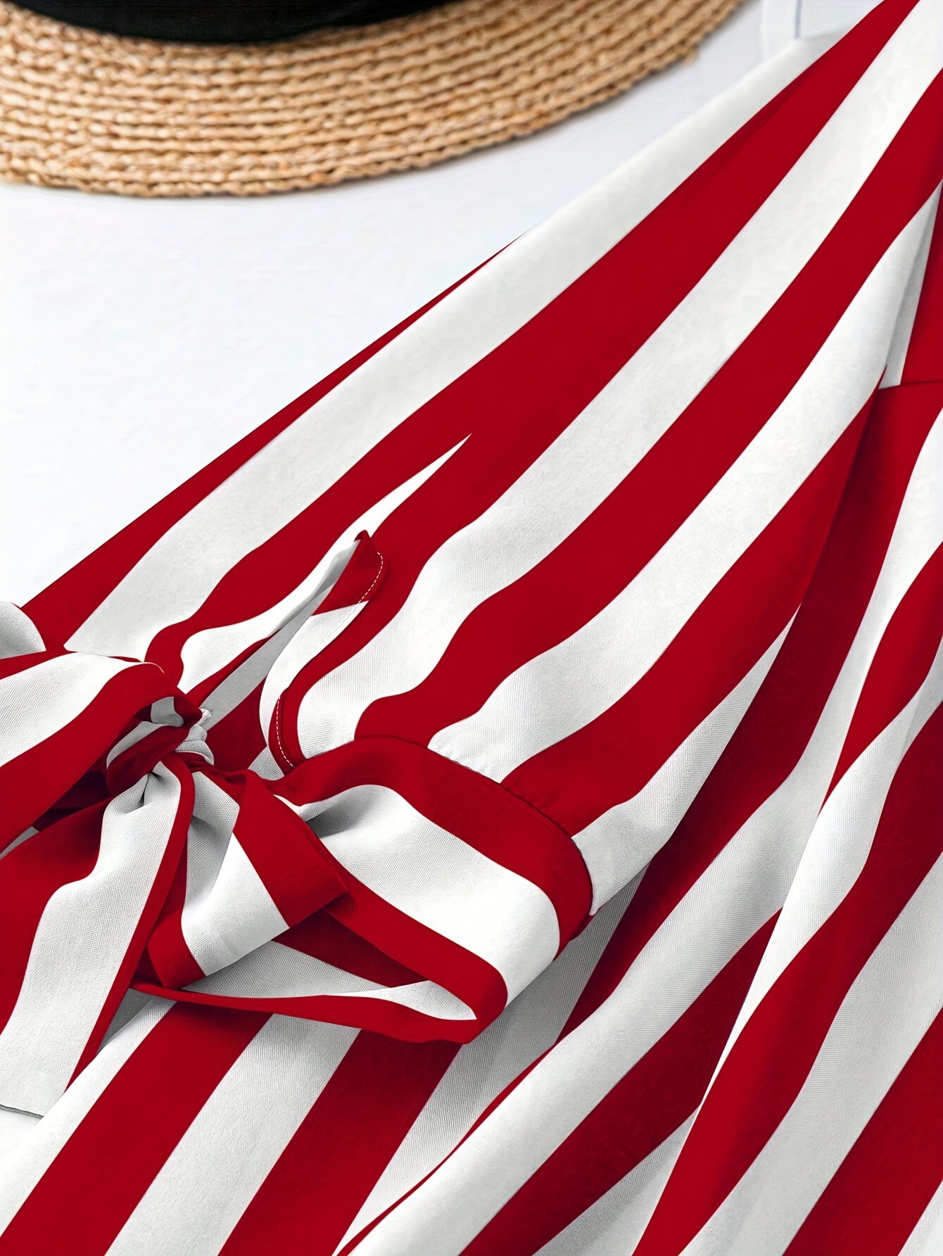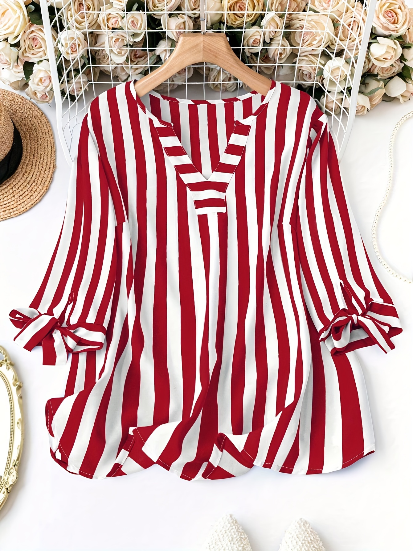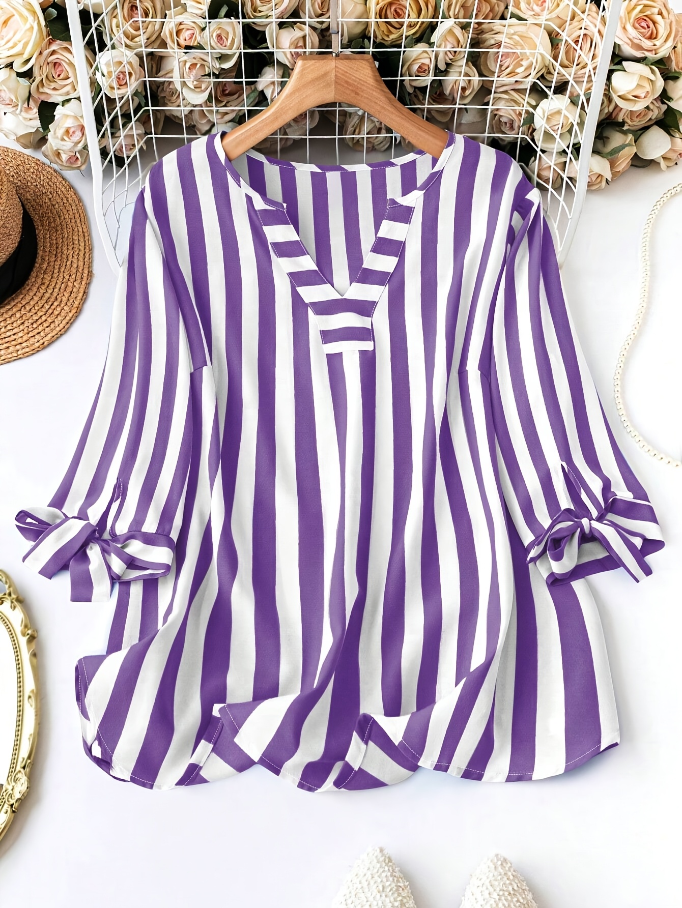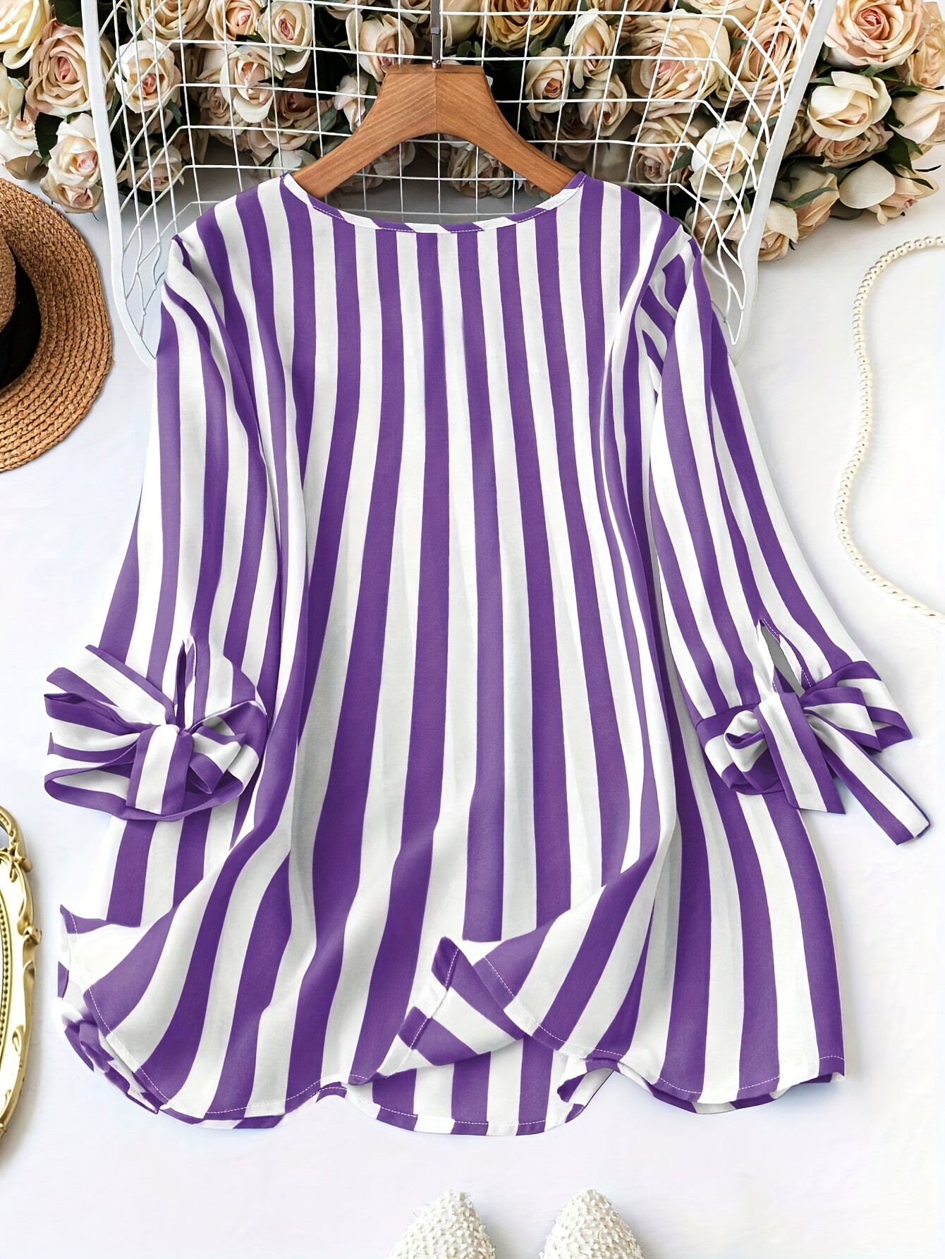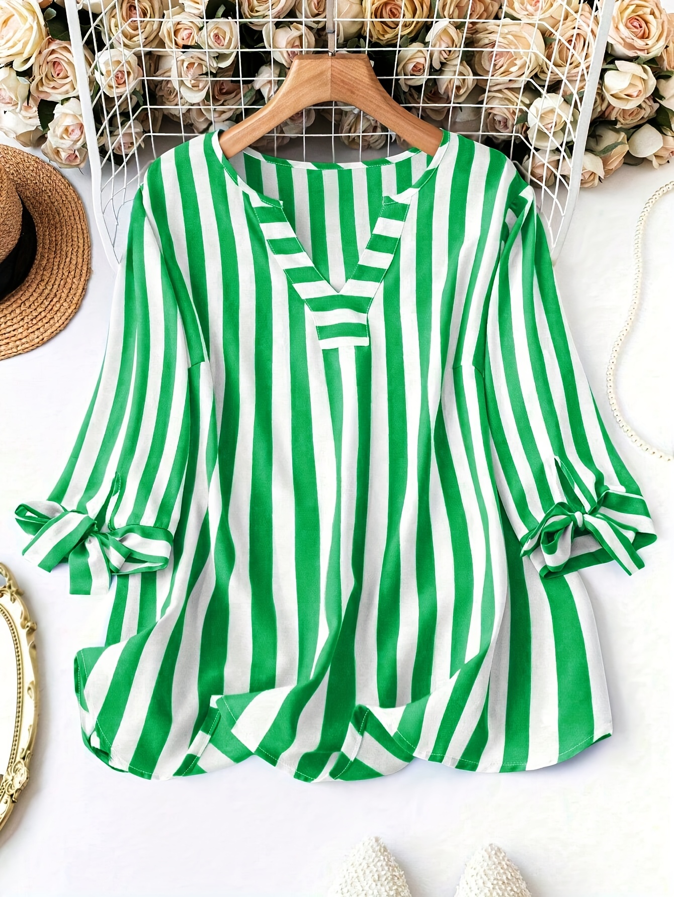 Plus Size Striped Print Blouse, Elegant Notched Neck Tie Cuff Top For Spring, Women's Plus Size Clothing