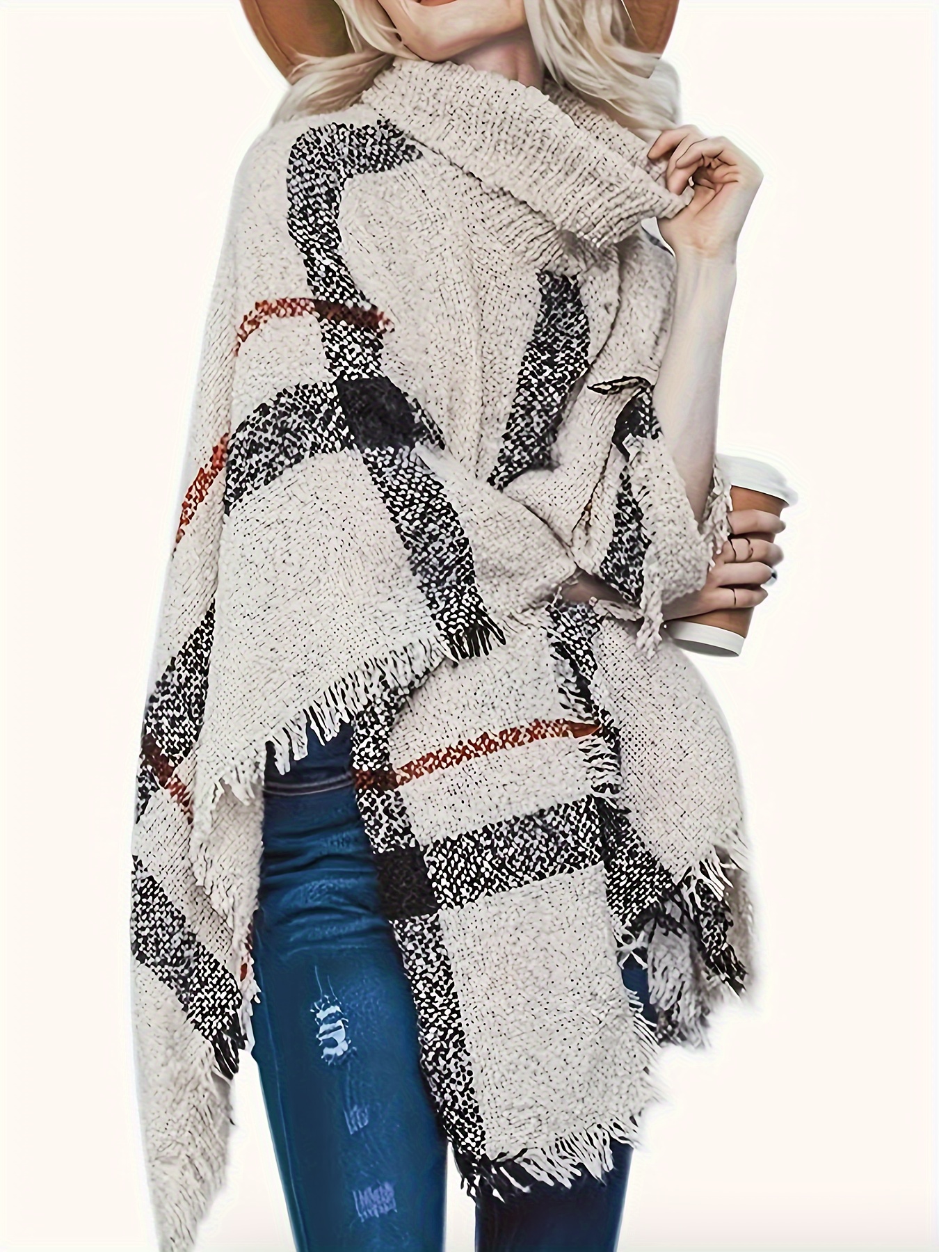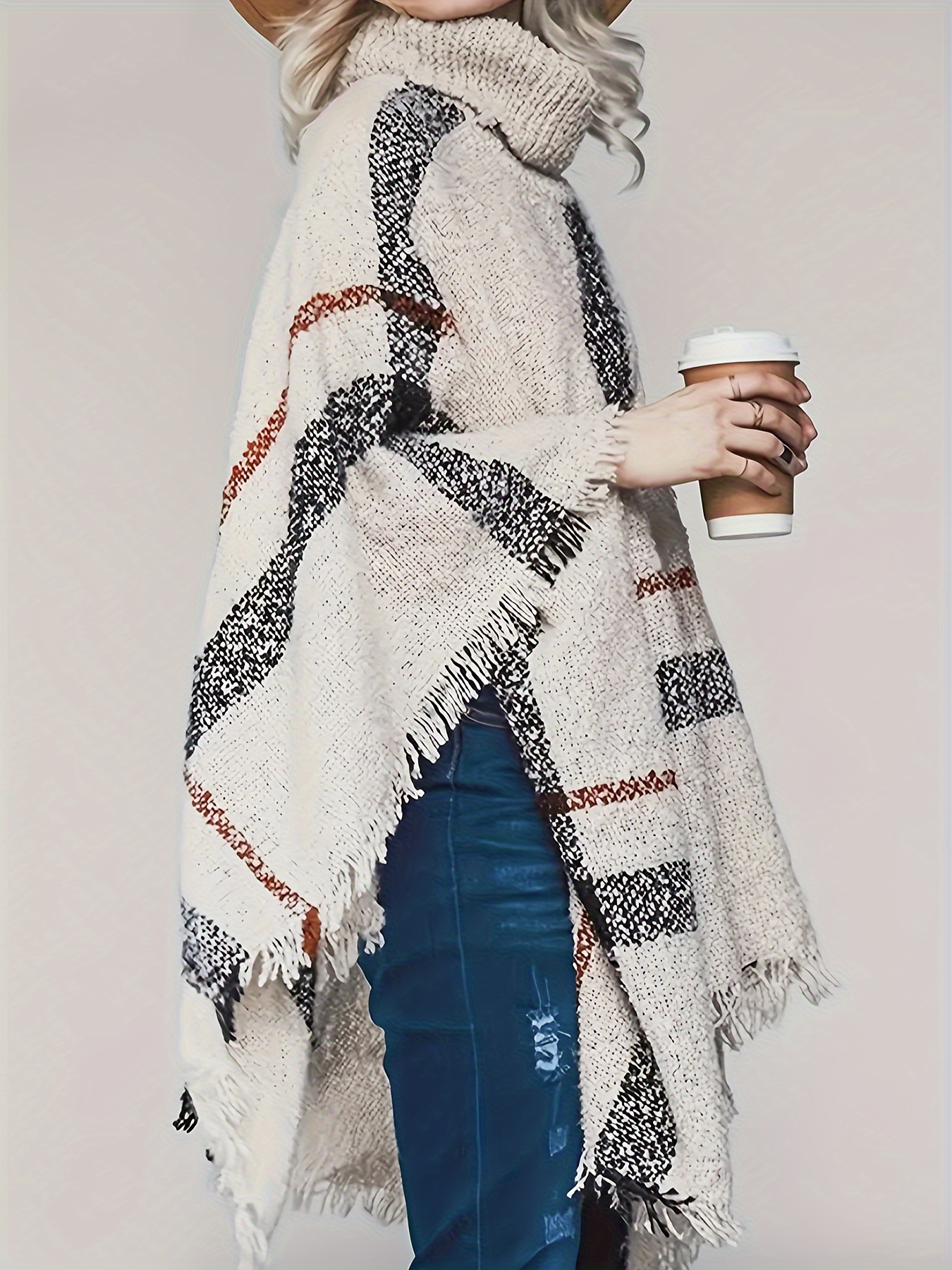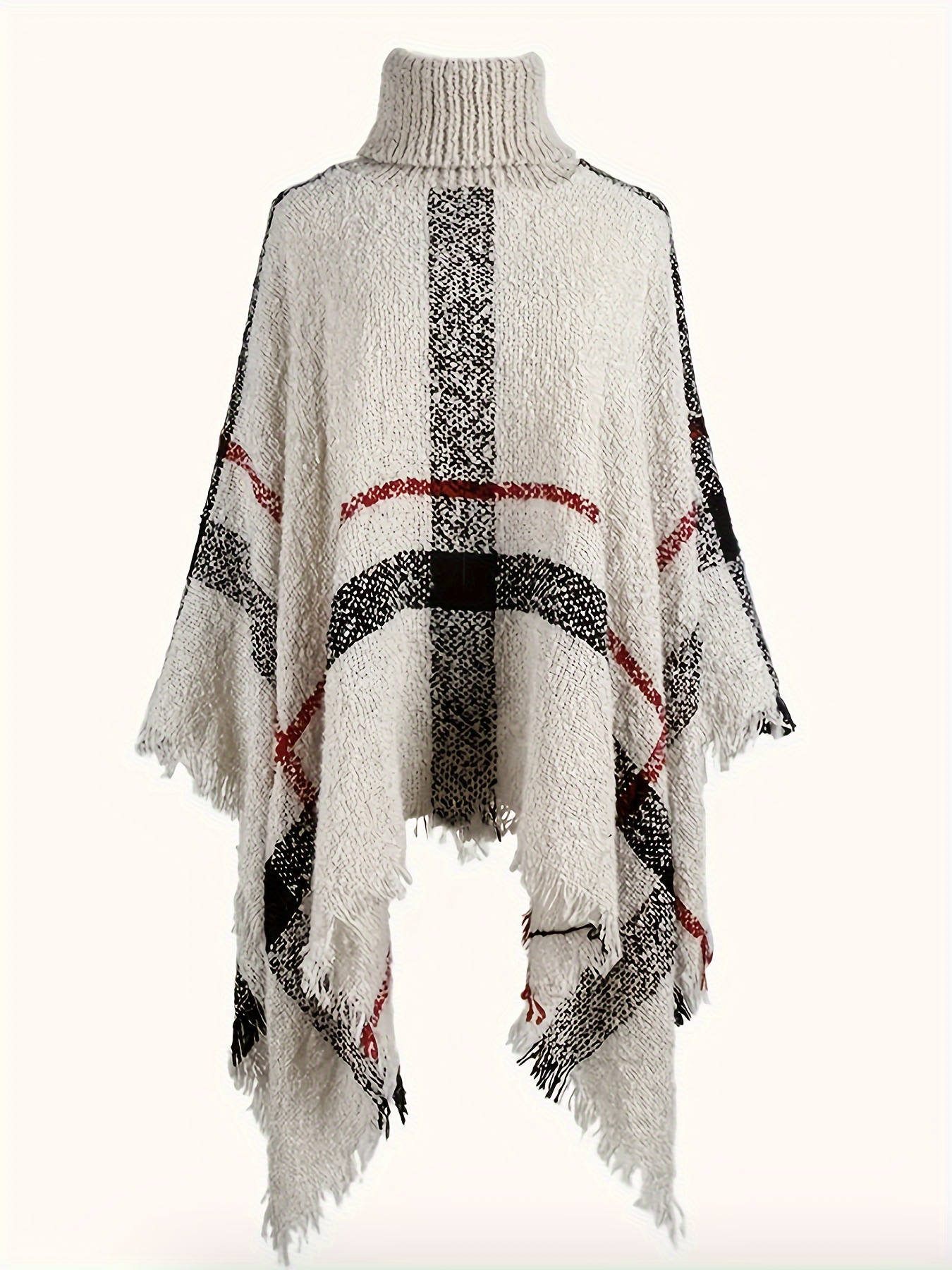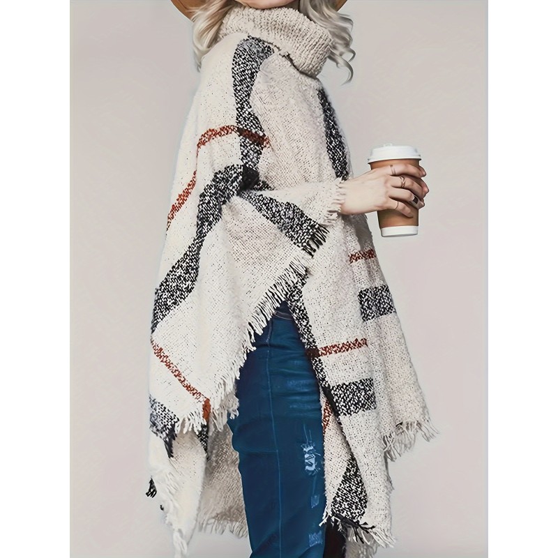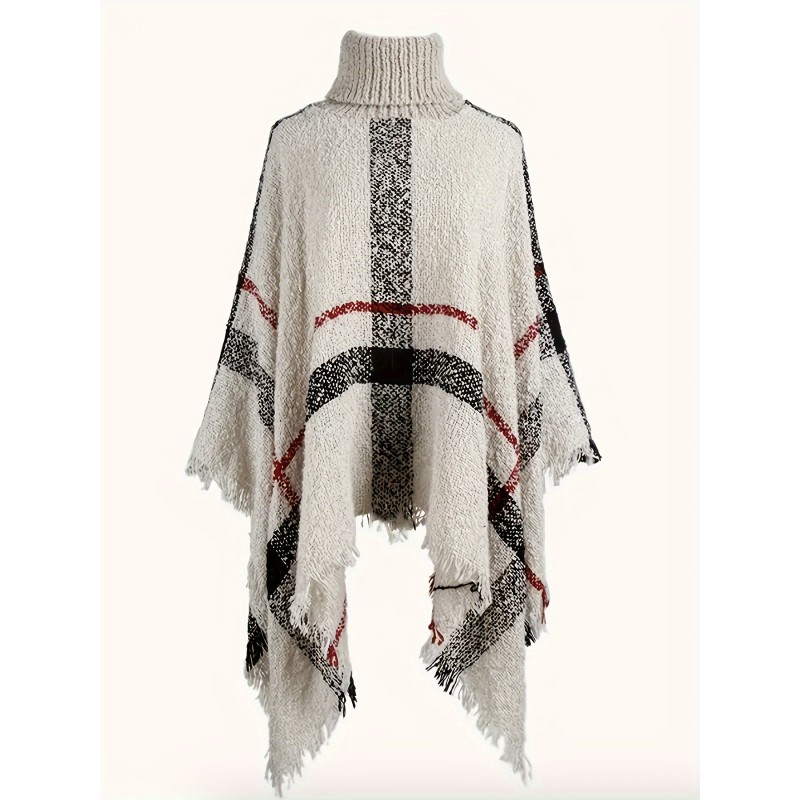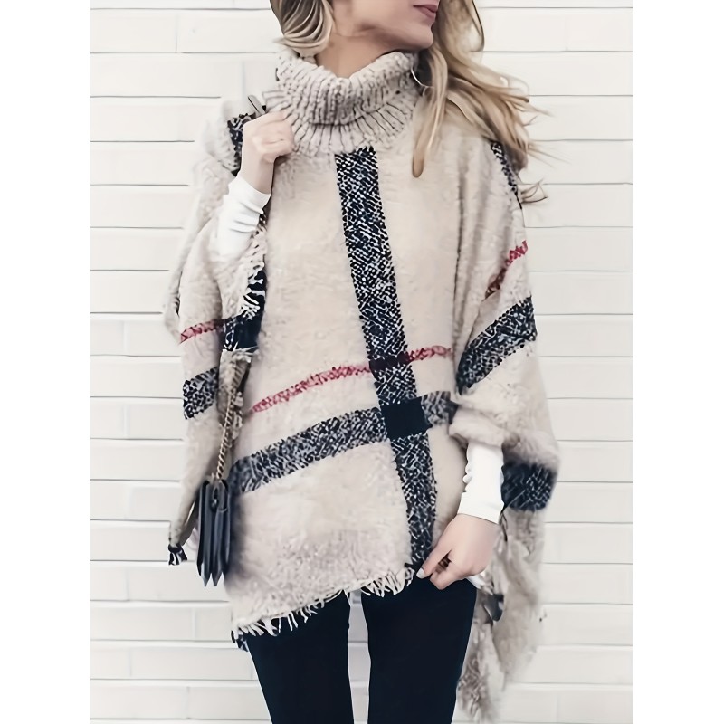 Elegant Plus Size Plaid Turtleneck Cape Sweater for Women - Cozy Acrylic, Fringe Detail, Perfect for Fall/Winter, Best for Christmas