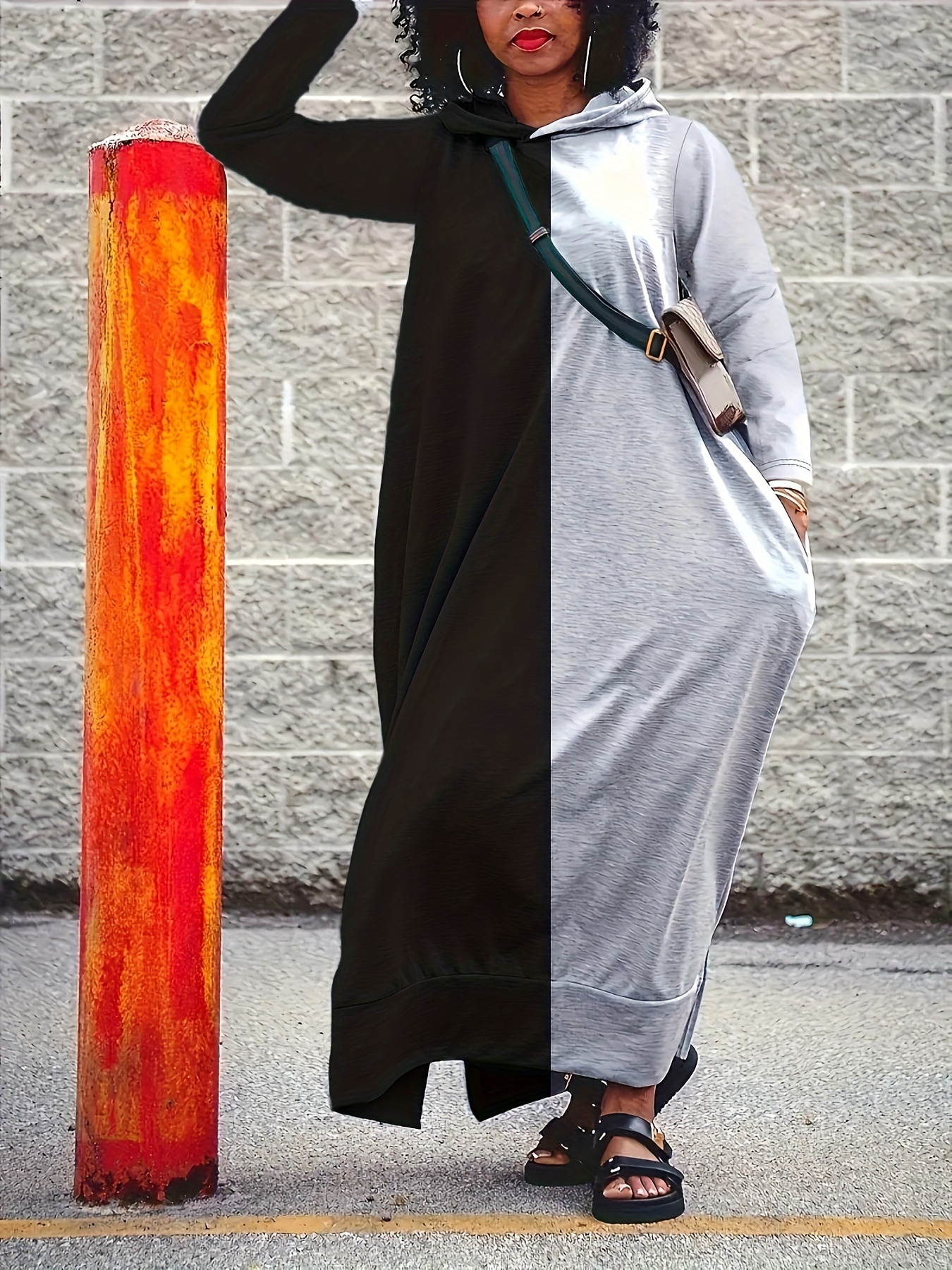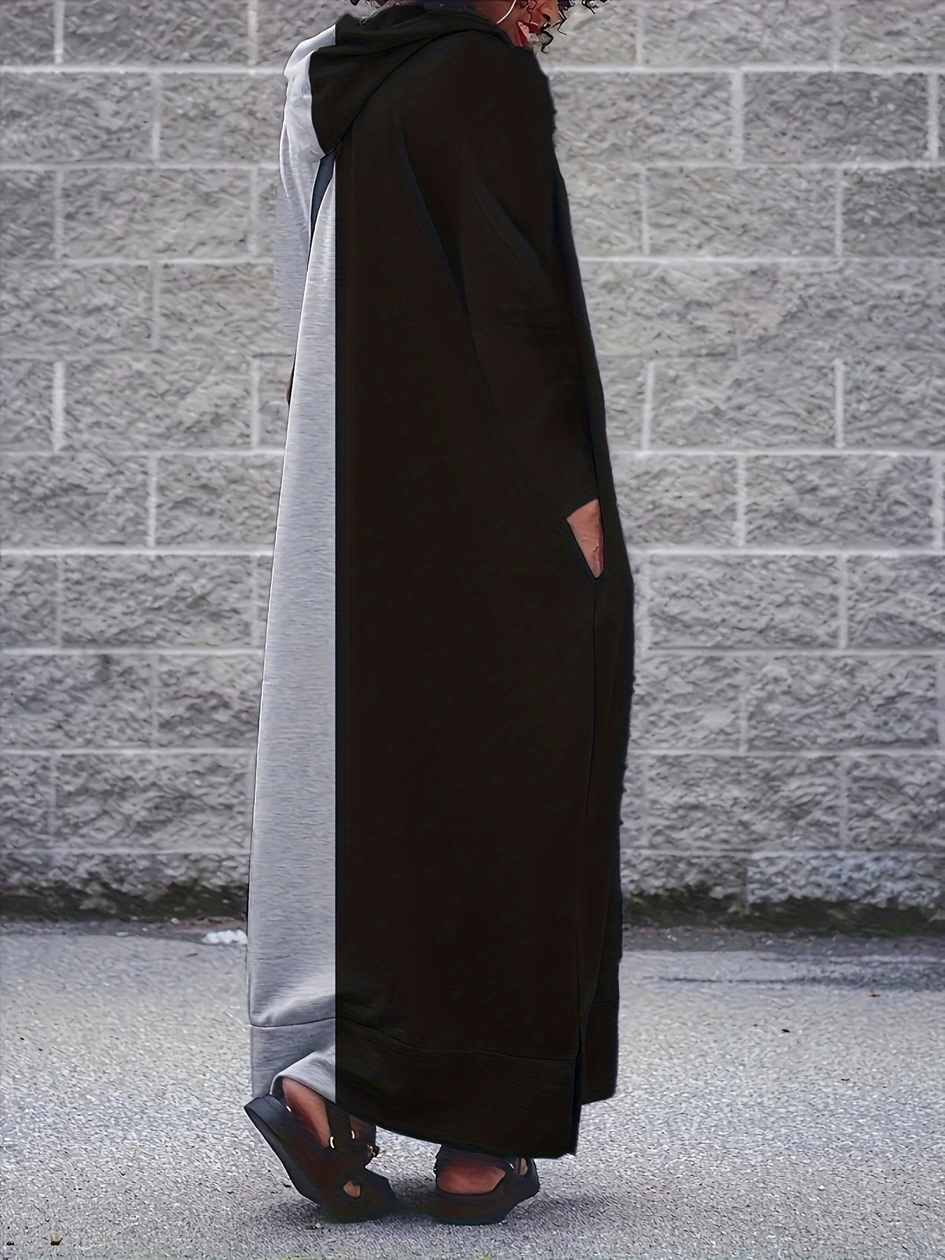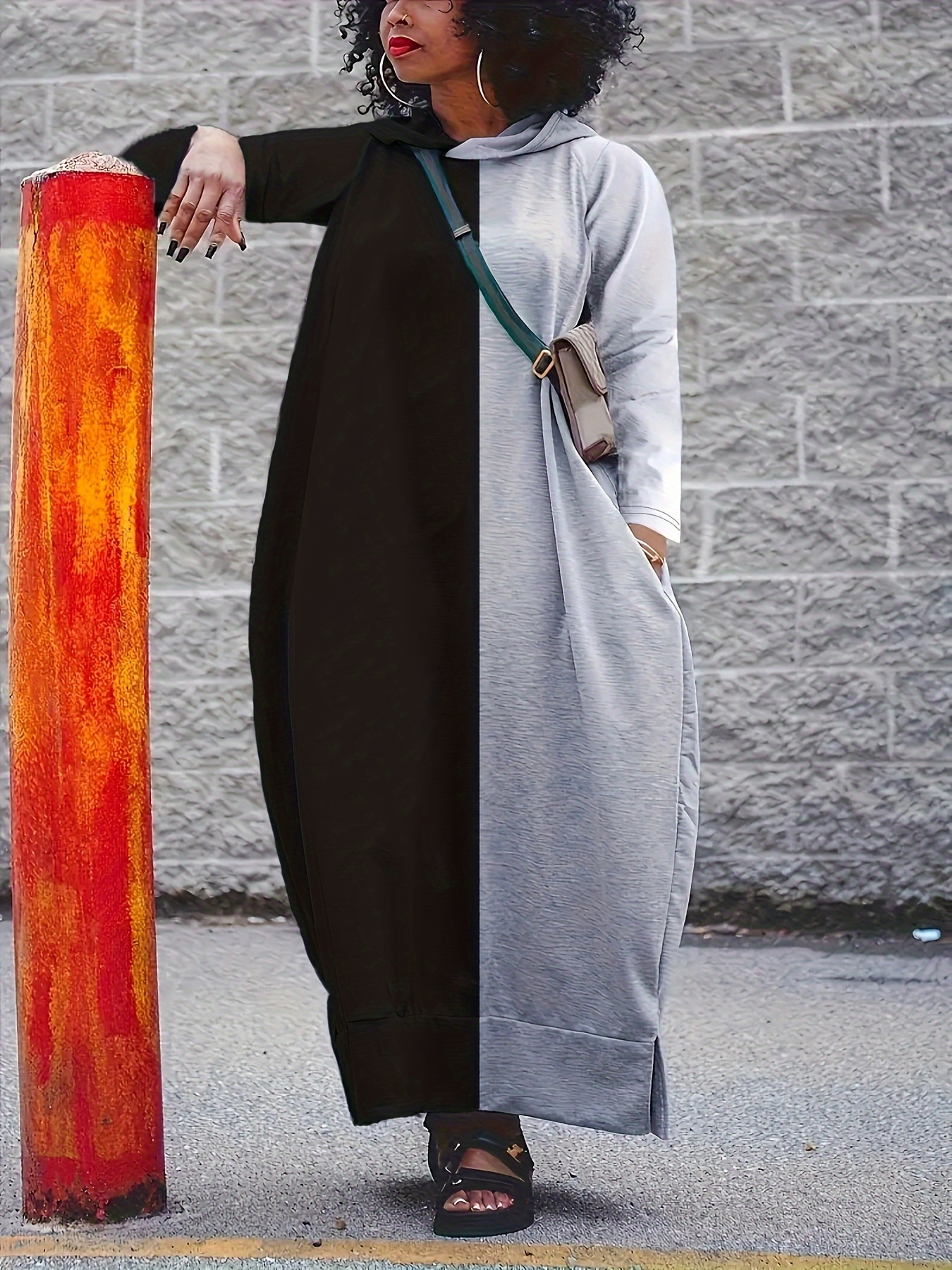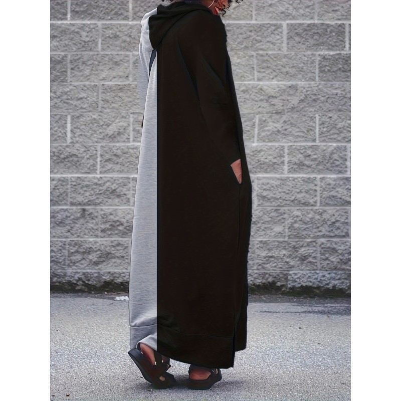 Plus Size Color Block Hooded Dress, Casual Long Sleeve Crew Neck Maxi Dress For Spring & Fall, Women's Plus Size Clothing