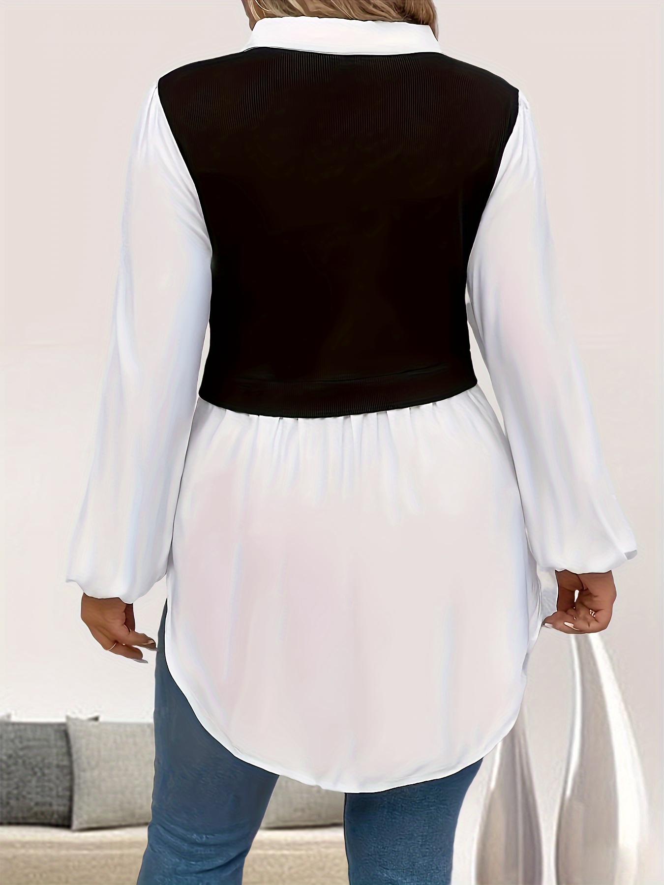 Plus Size Colorblock Polo Collar Blouse Casual Long Sleeve Blouse For Spring & Fall Women's Plus Size Clothing
