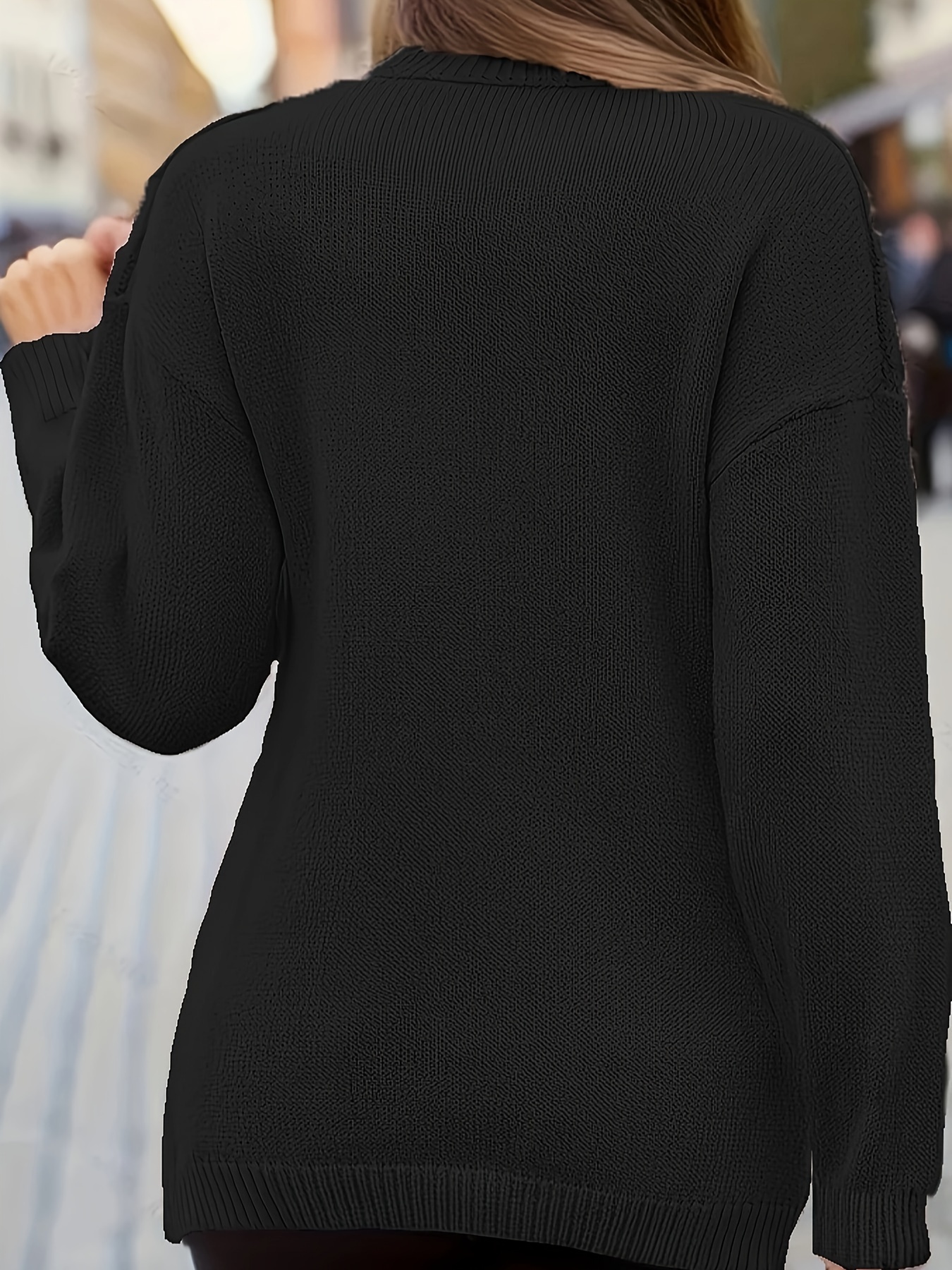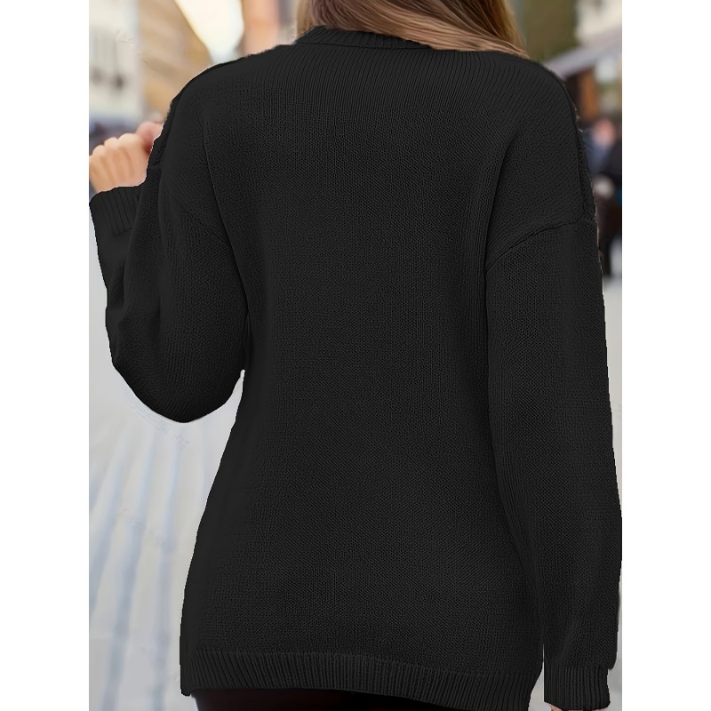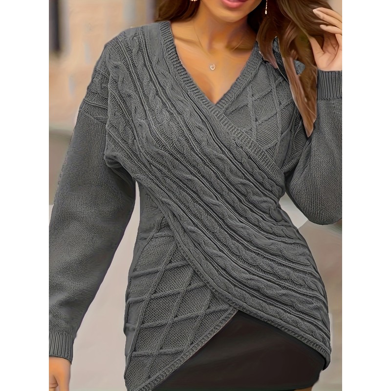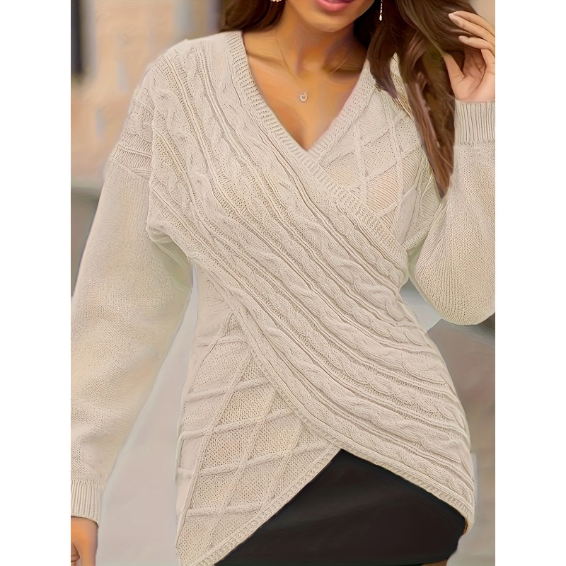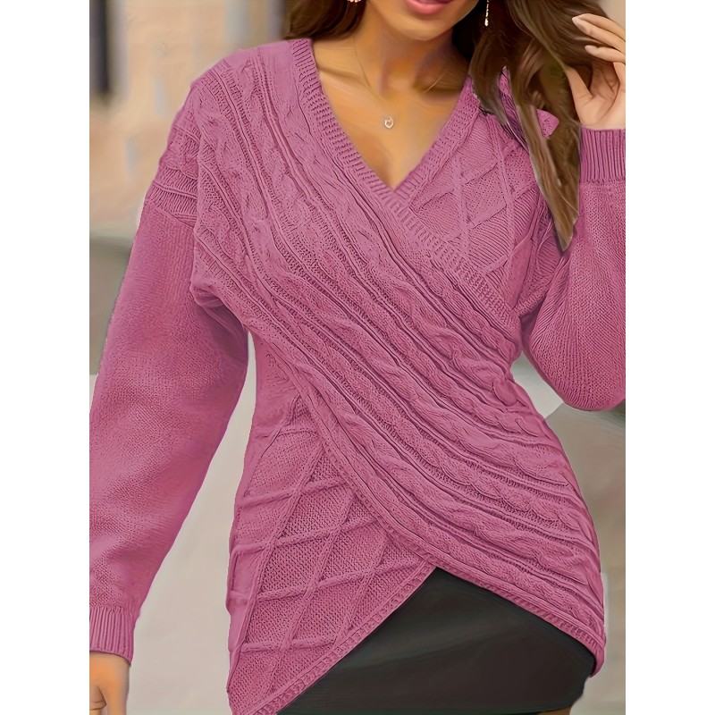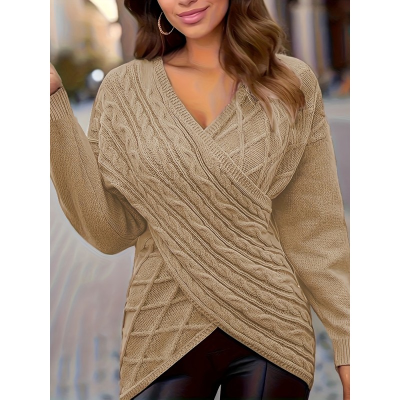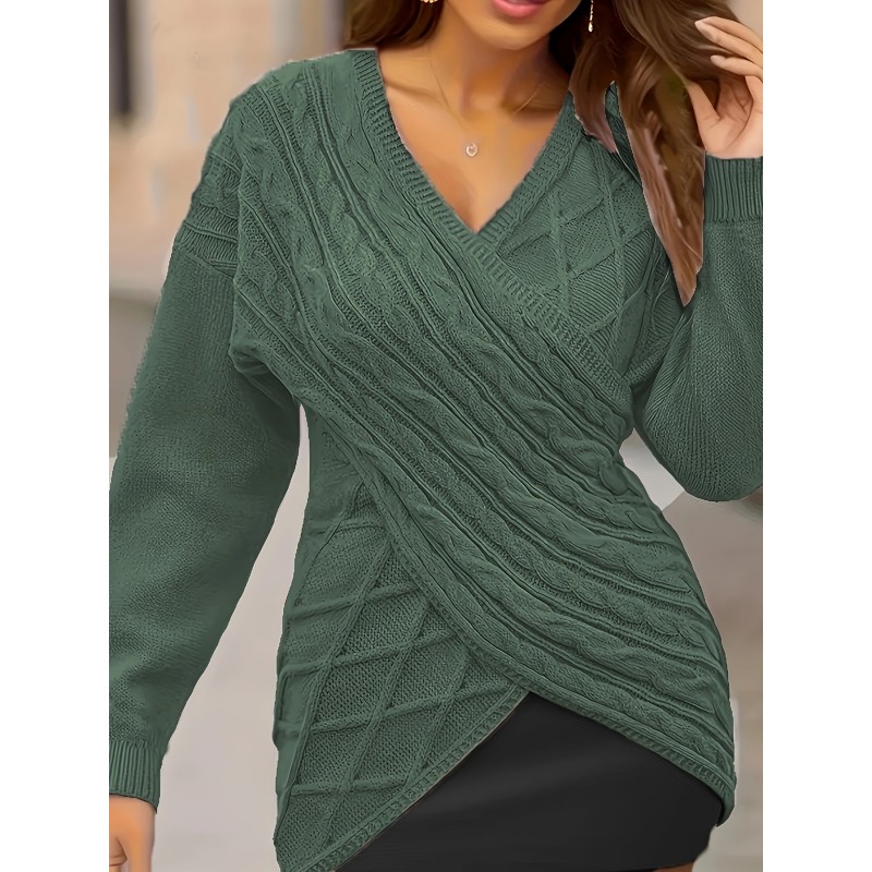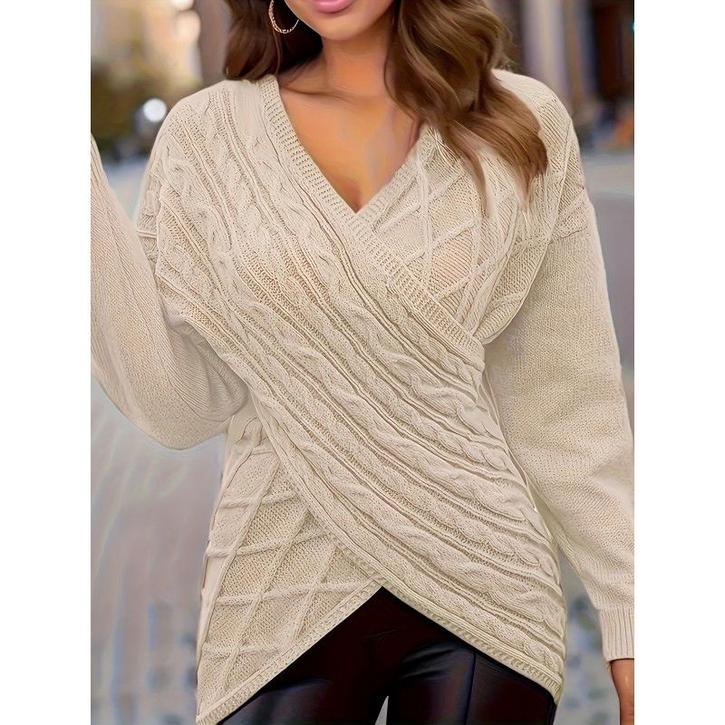 Plus Size Elegant Sweater, Women's Plus Solid Cable Drop Shoulder Long Sleeve Wrap Cross V Neck Jumper