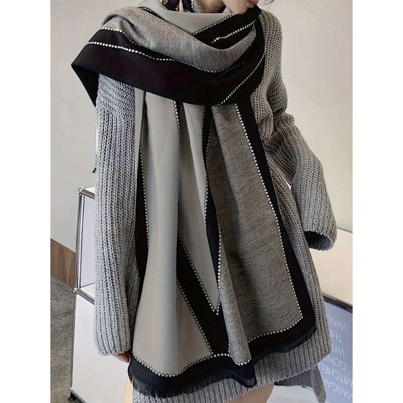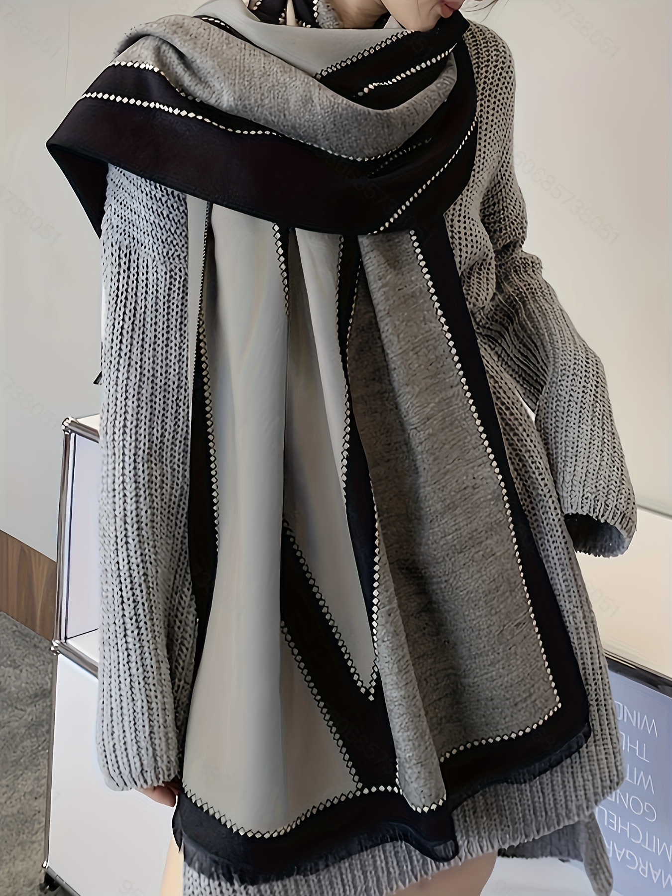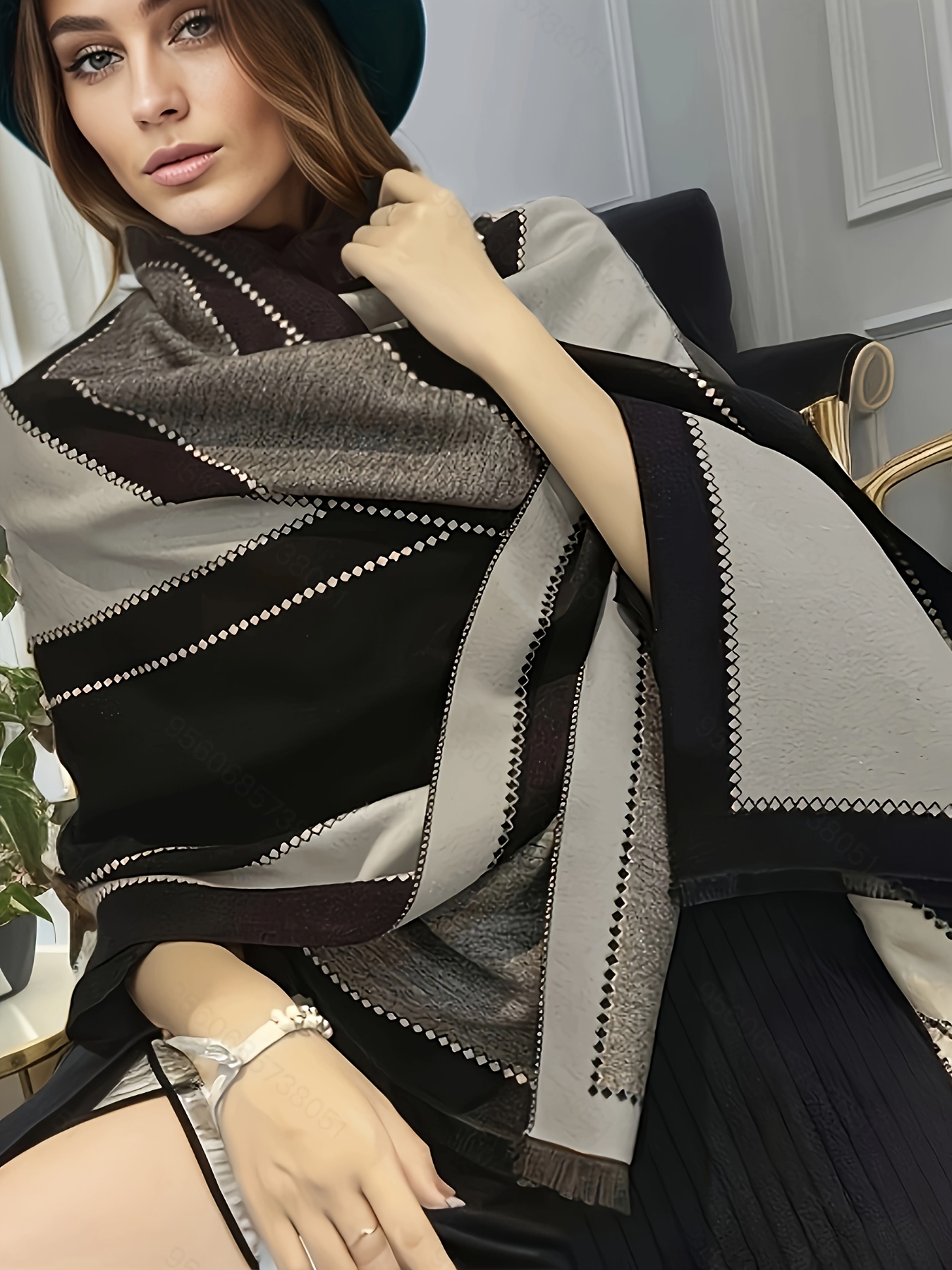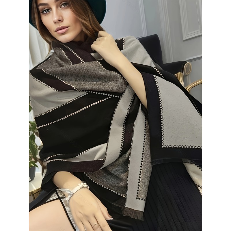 Plus Size Geometric Pattern Large Scarf, Soft Cozy Color Block Linen Shawl For Fall & Winter, Women's Plus Size Clothing