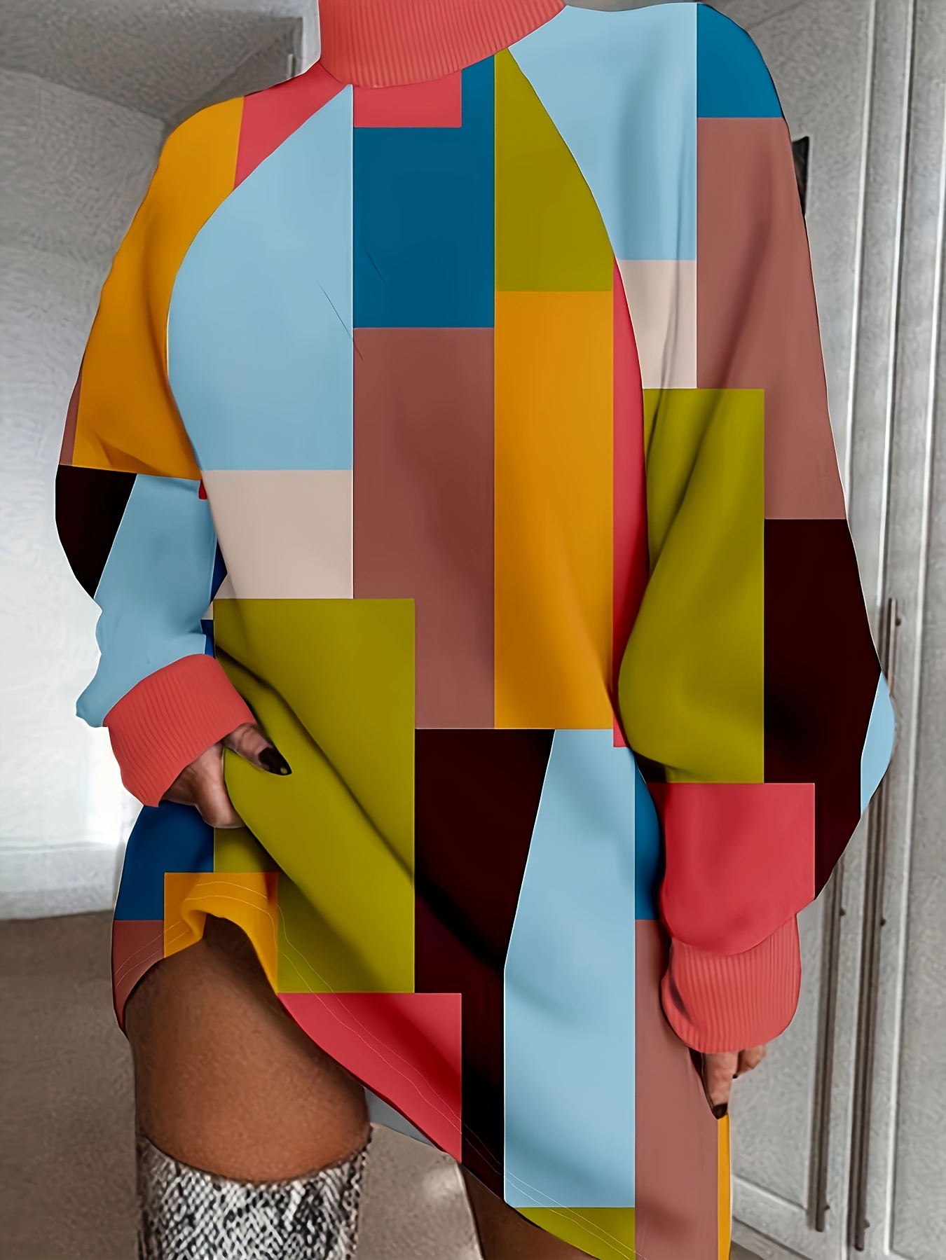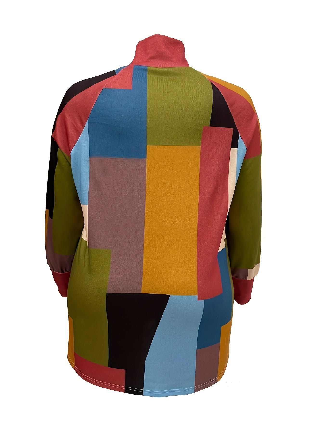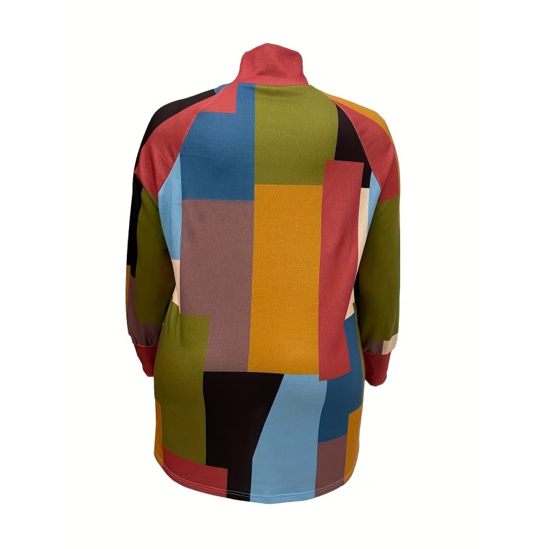 Plus Size Polyester Blouse Dress With High Neckline, Elastane, Digital Printing, Geometric Pattern, Spring/Autumn Fashion