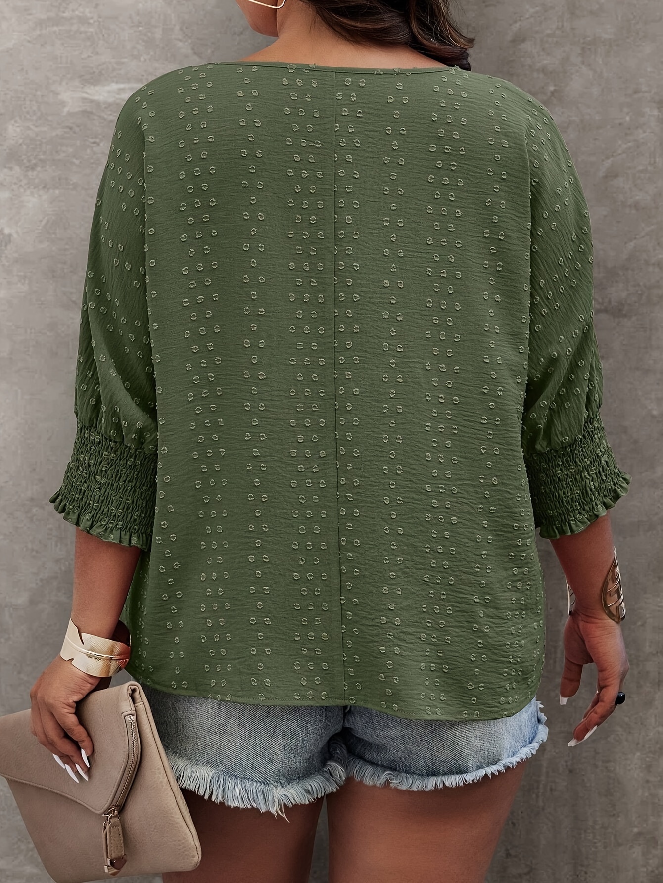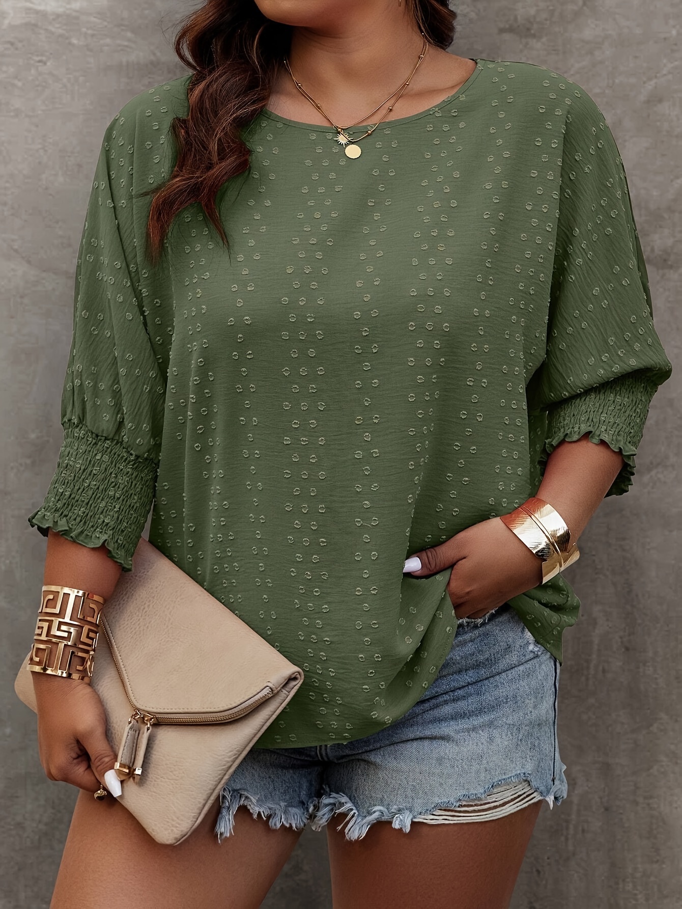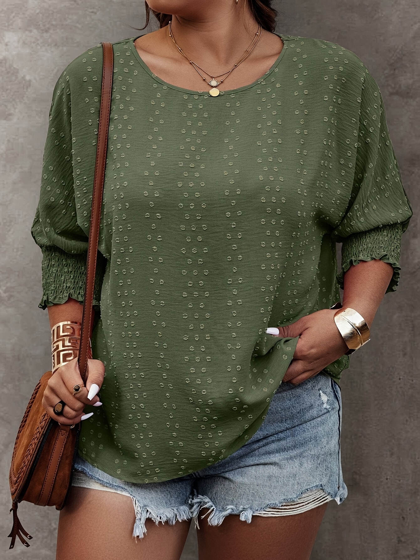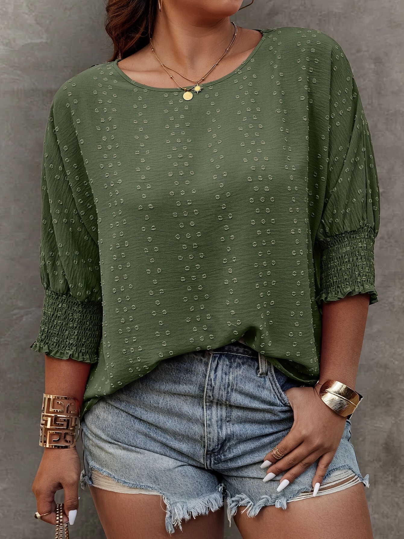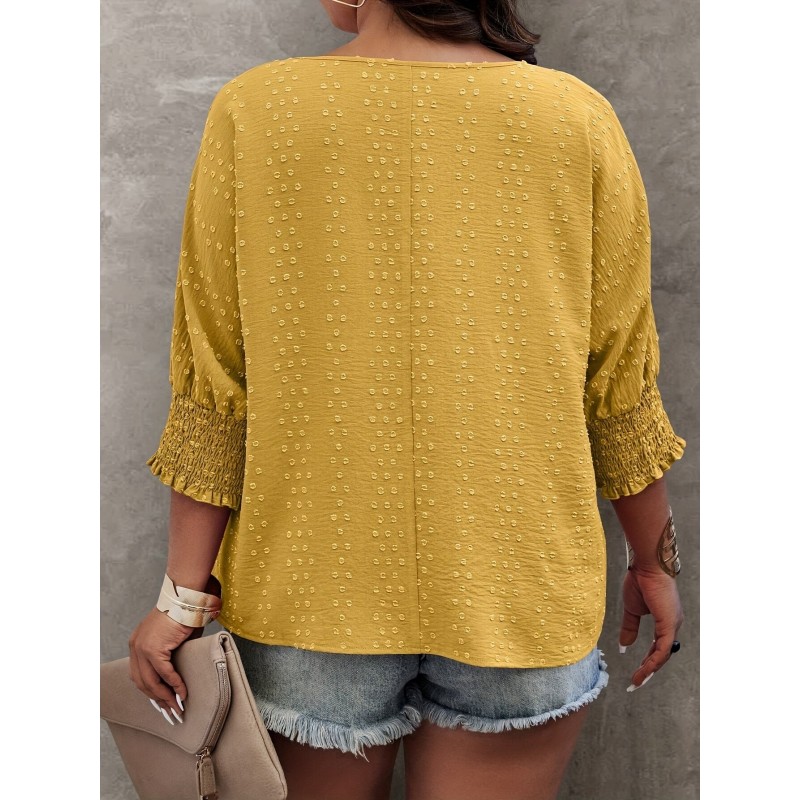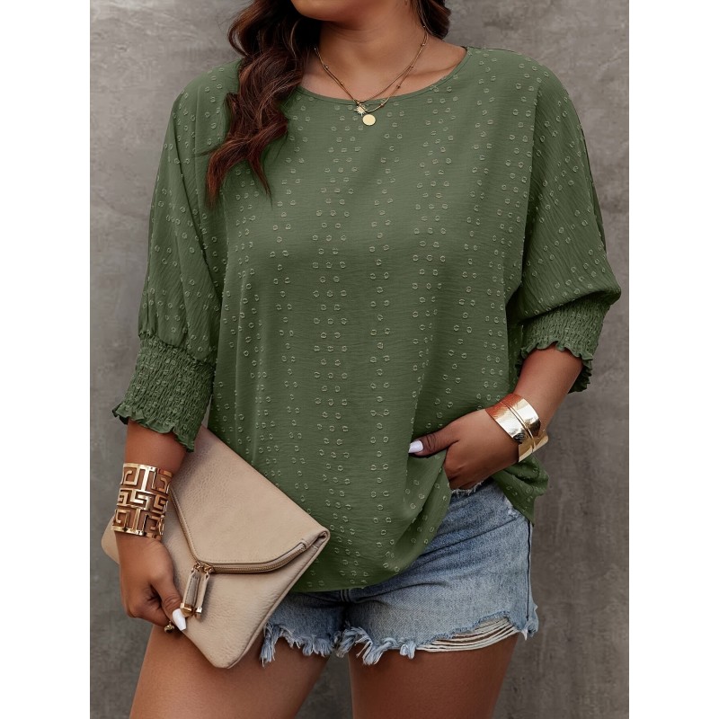Plus Size Solid Pullover Blouse, Crew Crew Neck Half Sleeve Shirred Cuff Blouse For Spring & Fall, Women's Plus Size Clothing