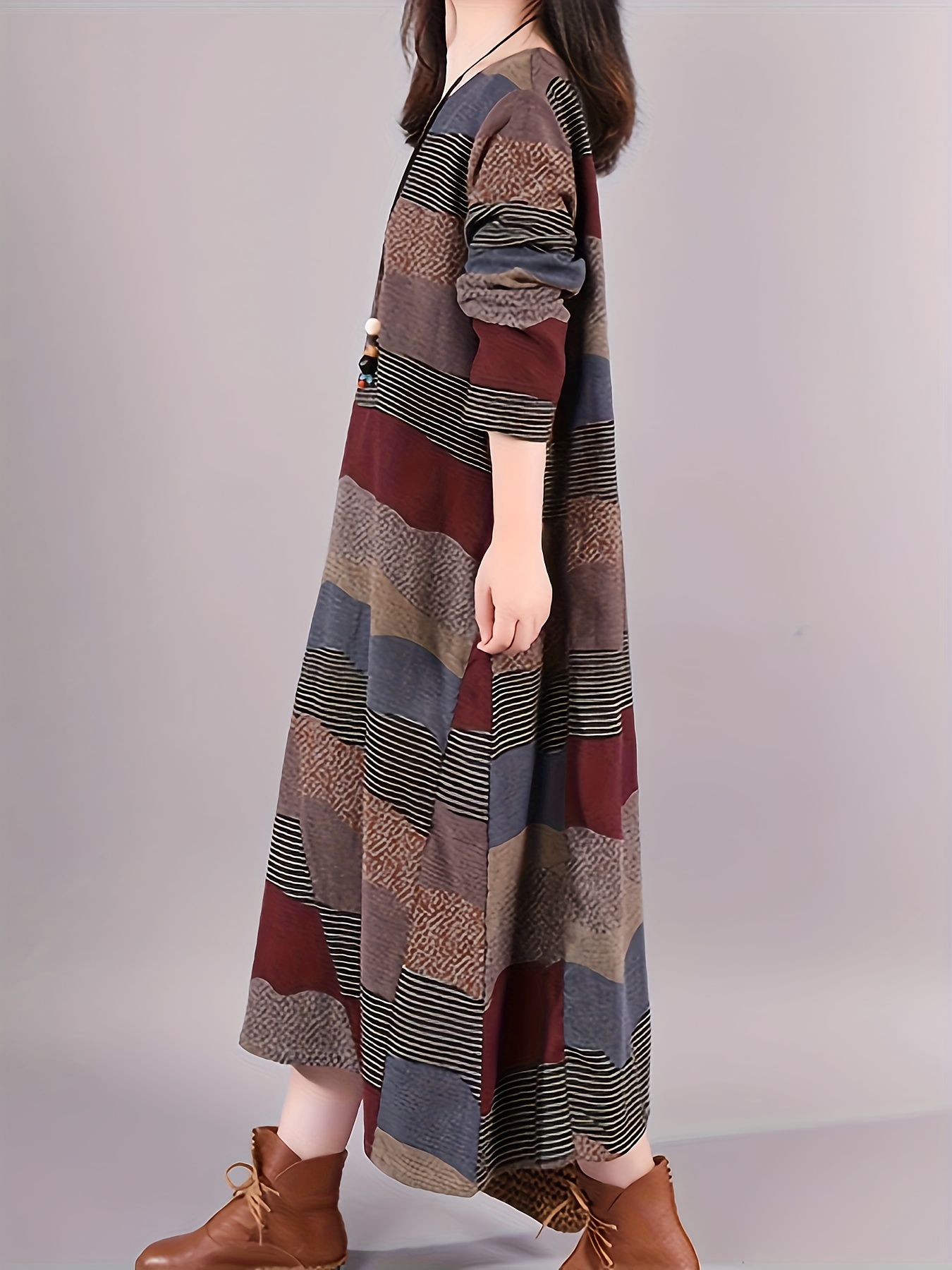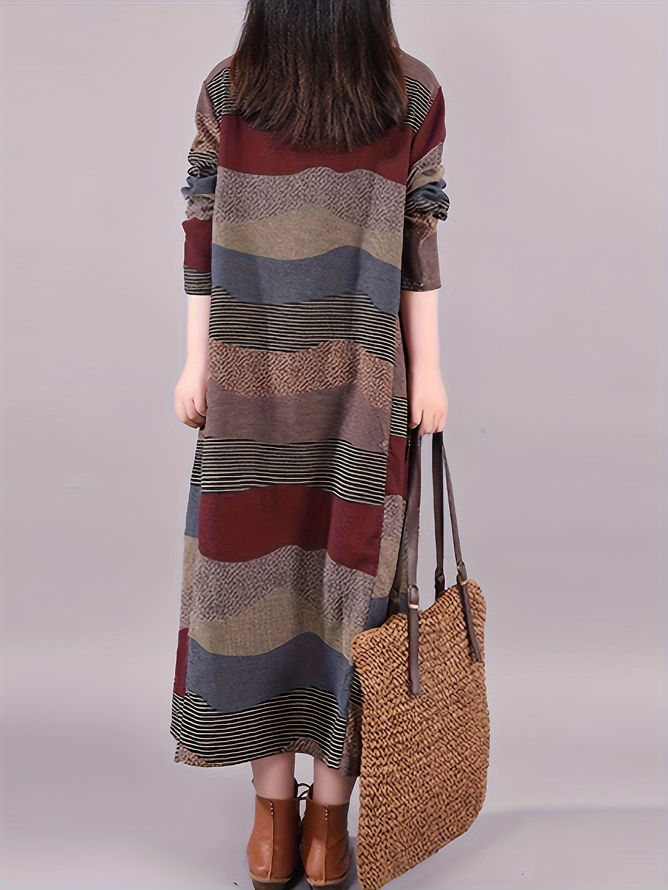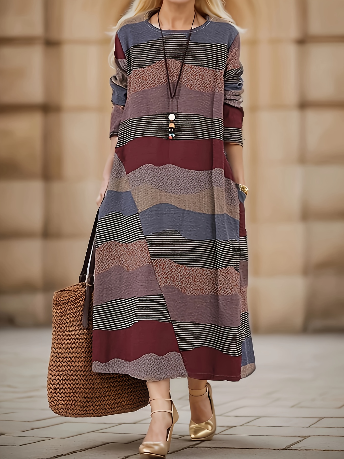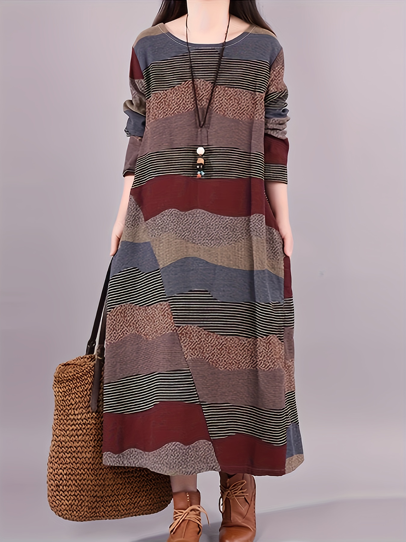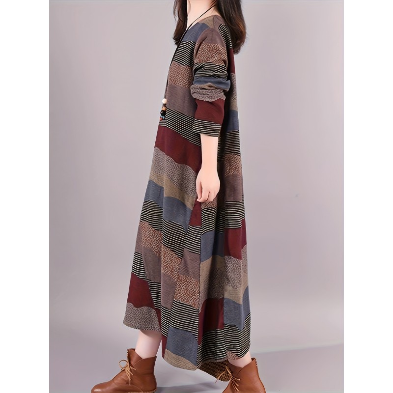 Plus Size Stripes Print Crew Neck Dress, Casual Long Sleeve Side Pockets Loose Asymmetrical Hem Dress For Spring & Fall, Women's Plus Size Clothing