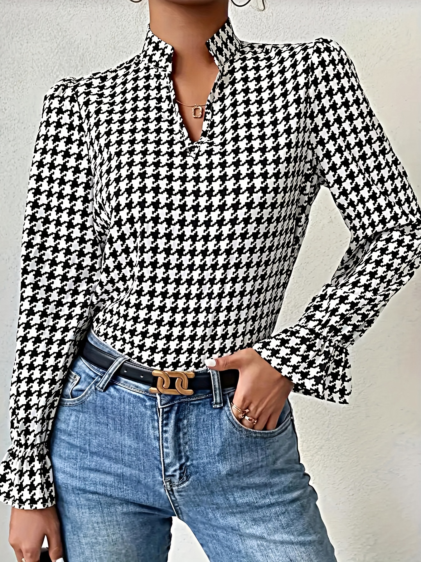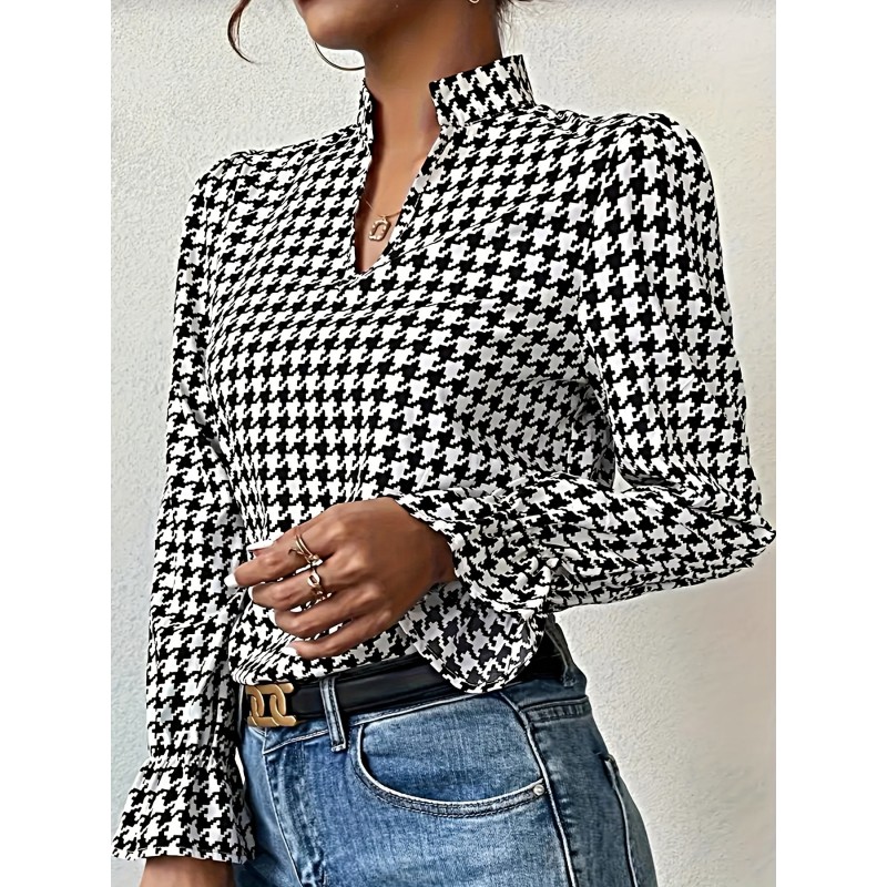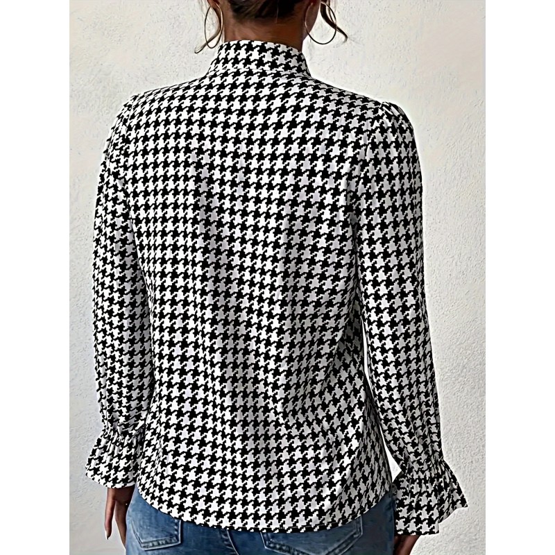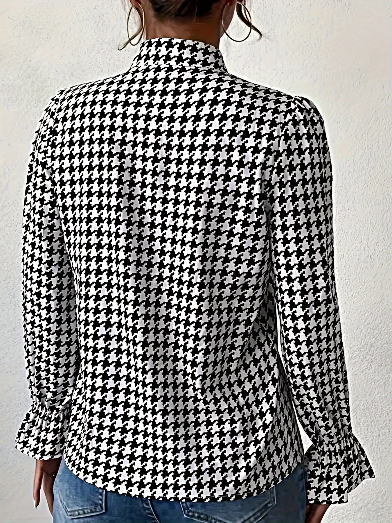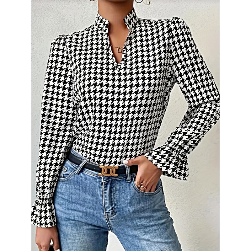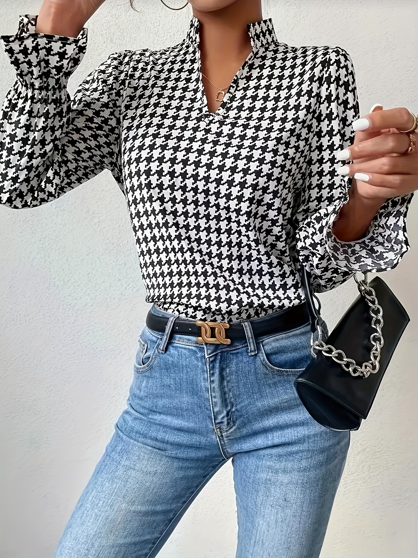 Elegant Plus Size Houndstooth V-Neck Blouse with Lantern Sleeves - Non-Stretch, Woven Polyester for All Seasons
