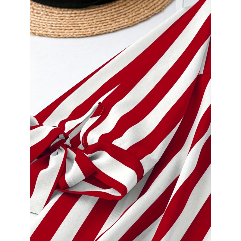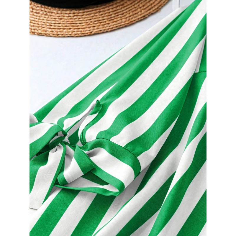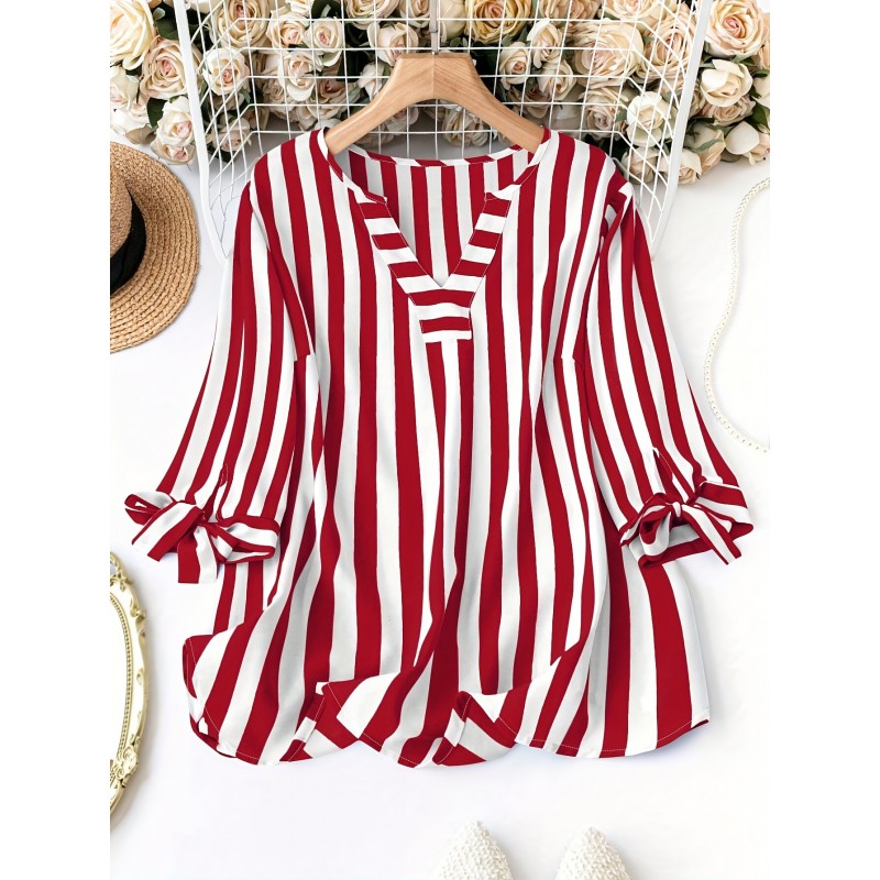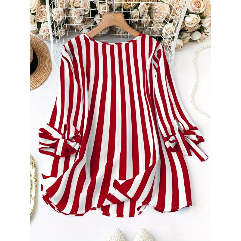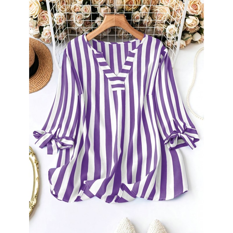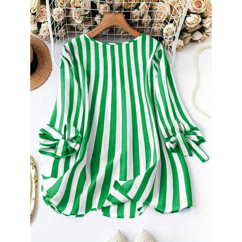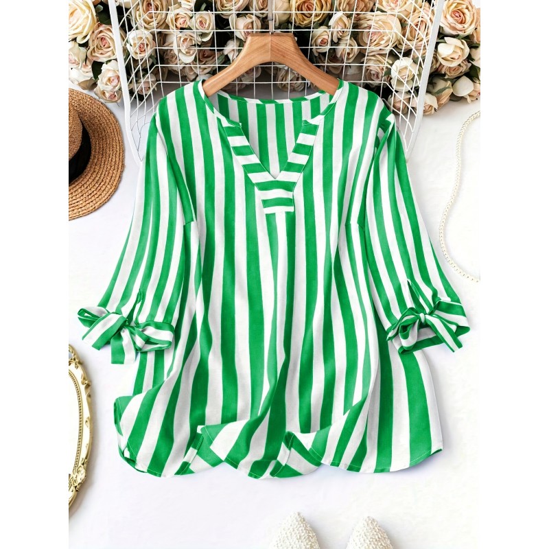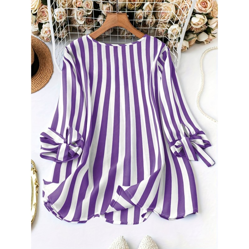 Plus Size Striped Print Blouse, Elegant Notched Neck Tie Cuff Top For Spring, Women's Plus Size Clothing